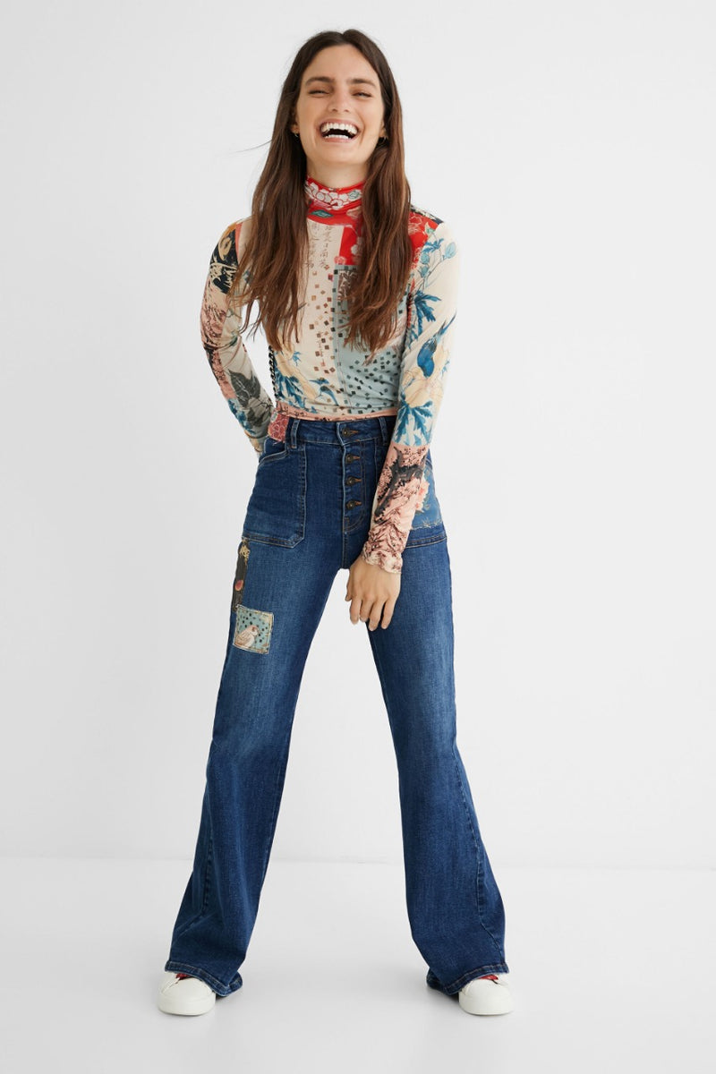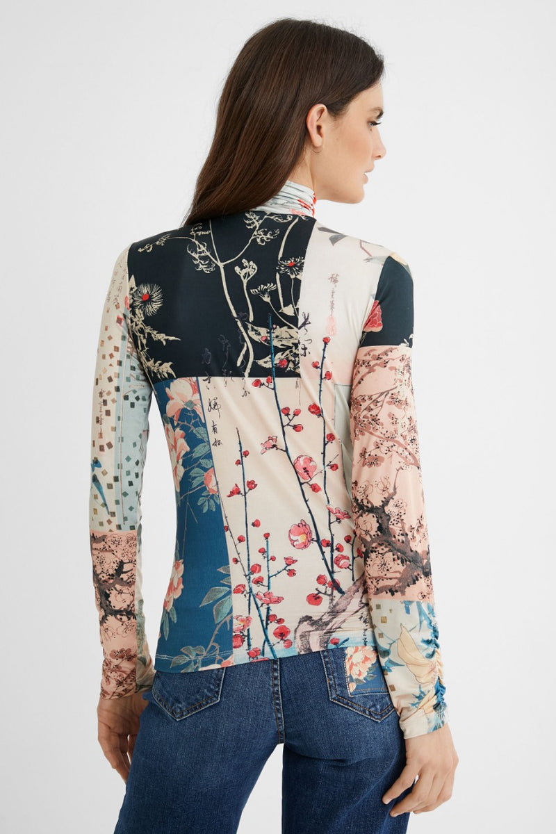Flores, pájaros y geometrías se mezclan de forma elegante y colorida en el patch digital de estampados, manga larga con cuello alto y una favorecedora silueta slim.